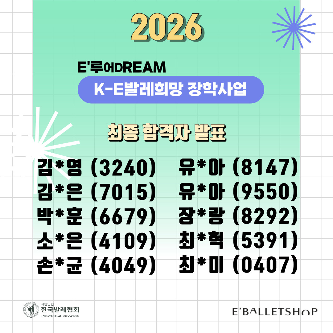 E'루어DREAM 발레 장학생 선정자분들께는 추후 시상식 관련 안내 연락드릴 예정입니다.